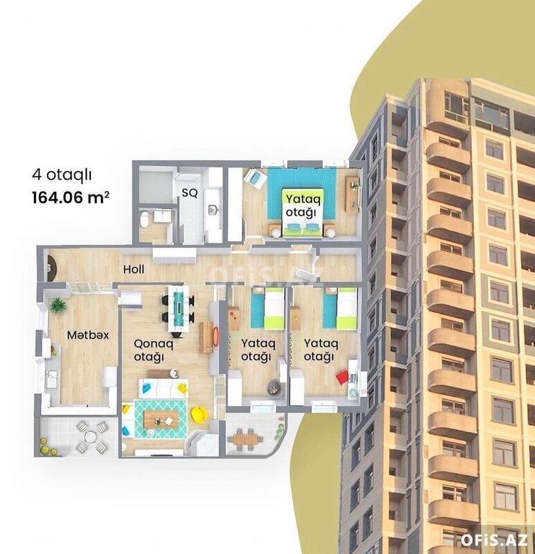 ümumi sahəsi – 52 kv/m, 16/10-cü mərtəbəsindədir.