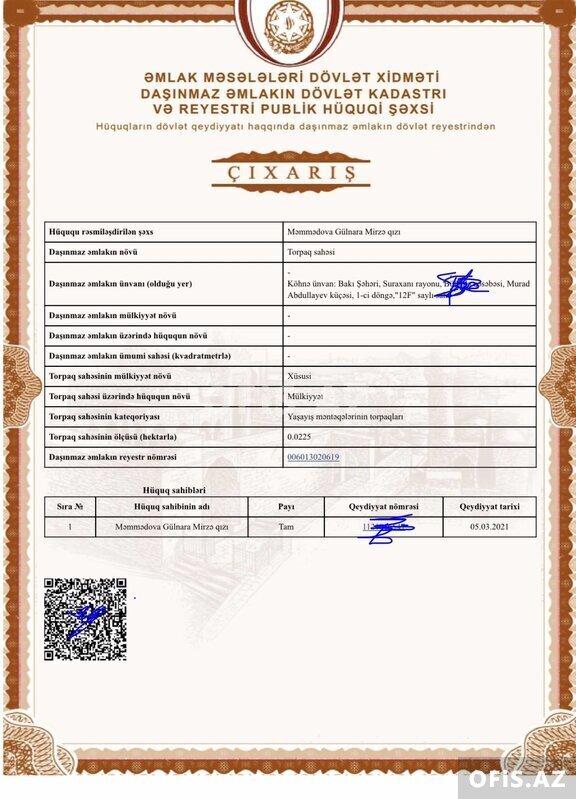 Bakıxanov, (Razin) Akkordun binaları ilə üzbəüz, Murad Abdullayev küçəsi, Döngə-1 ünvanında, 2.5 sot, Kupçalı (Çıxarışlı) torpaq satıram. Torpaq əsas yoldan, 100-metrlik məsafədə, Heydər Əliyyev prospektinə, yaxın yerdə yerləşir. Yolu asvaltdı. Zaborun içərisində olan Torpaqda, Qaz, Su, İşıq, Mərkəzi kanalizasiya sitemi, Telefon, İnternet var. Məktəb, Baxça, Marşrut xətti yaxınlıqdadı. Torpaq, Çox əlverişli yerdə yerləşir. Torpağın ölçüləri 10+25 (Təxmini ölçüsü). Ev tikmək üçün, tam hazır, vəziyyətdədir. Ümumi qiyymət: 75000azn. Real alıcı olarsa, qiyymətdə razılaşmaq olar. Torpaq şəxsidi və mənə məxsusdur.