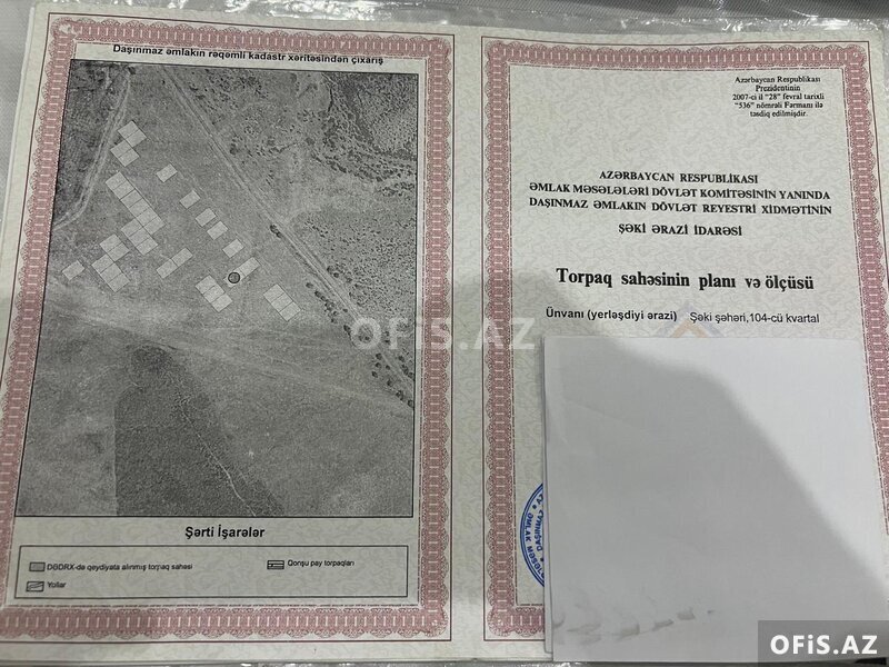 Şəki Şəhəri 104 cü kvartal ünvanda yerləşən Mərkəzi xəstaxanaya, Asan Xidmət Mərkəzinə və Dayan dincəl yaxınlığında səfalı yerdə yerləşən əsas yola yaxın 0.06 ha ideal həyətyanı torpaq sahəsi (kvartalda qaz, işıq, su, internet xətti mövcuddur)